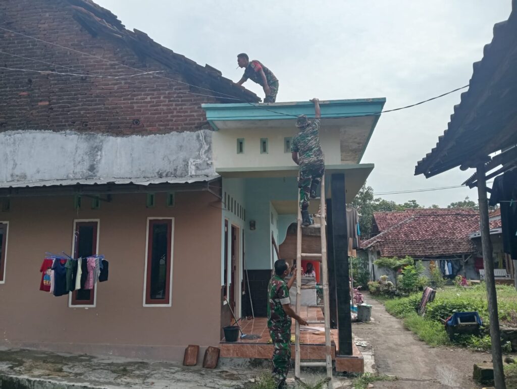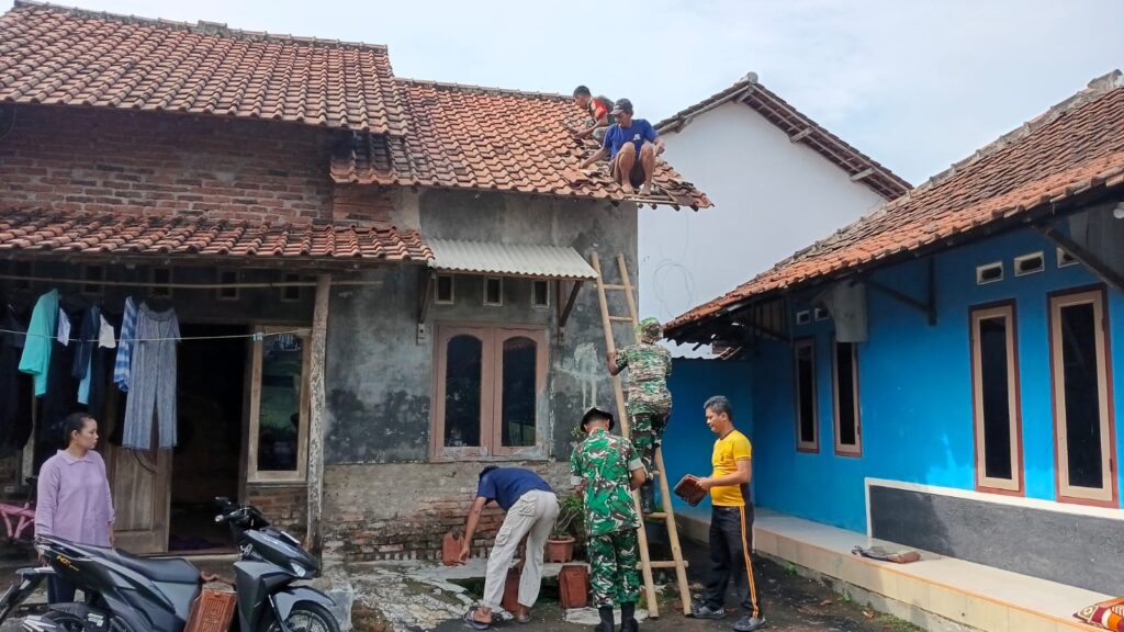 Babinsa Koramil 0620-01/Gunungjati bersama pemerintah Desa Buyut dan berbagai komponen masyarakat melaksanakan kegiatan karya bakti perbaikan atap rumah warga yang mengalami kerusakan akibat hujan besar yang melanda wilayah Kecamatan Gunungjati.