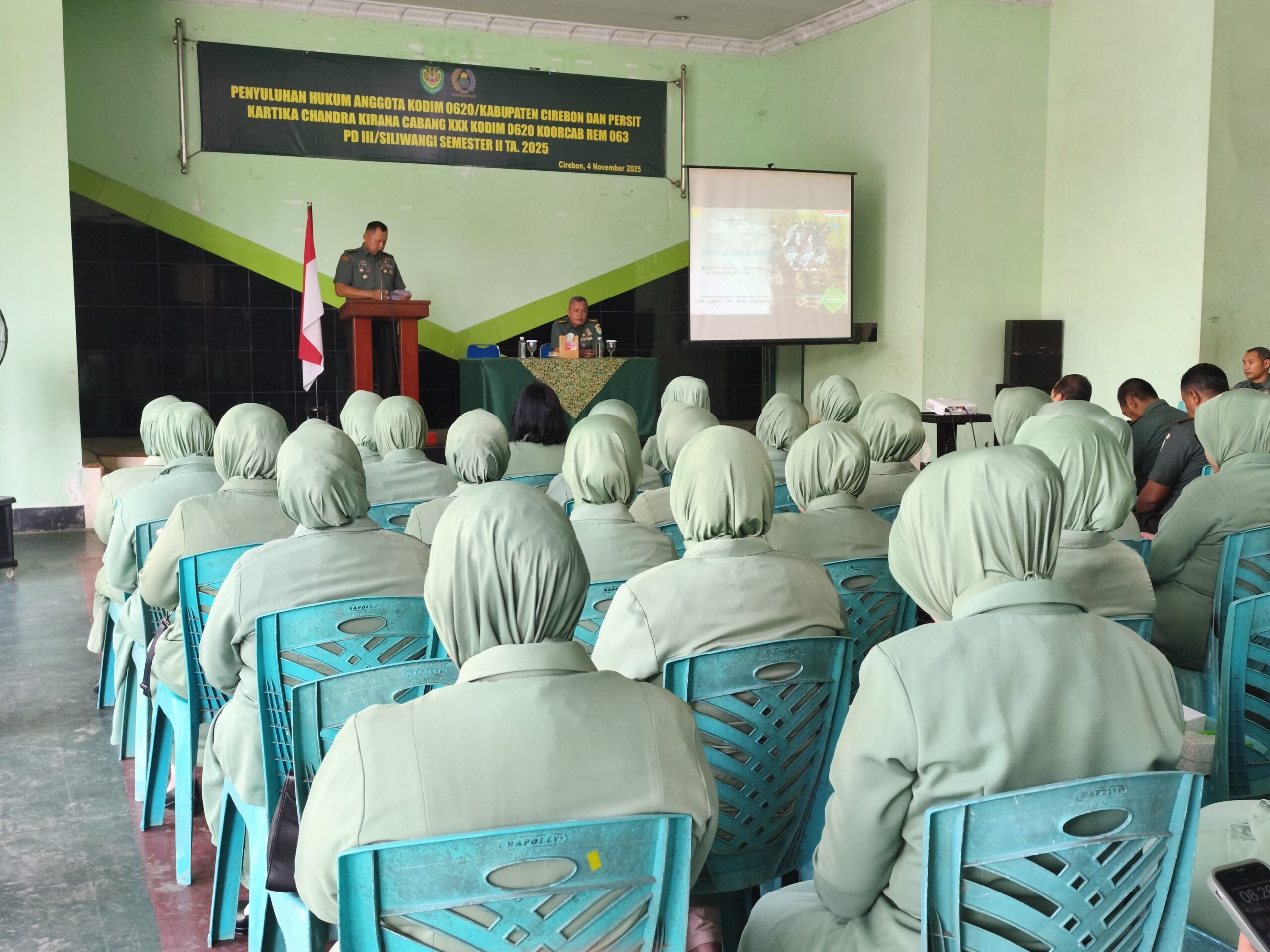 Cirebon, 4 November 2025, Dalam rangka meningkatkan pemahaman dan kesadaran hukum di lingkungan TNI AD, Kodim 0620/Kab. Cirebon menyelenggarakan kegiatan Penyuluhan Hukum bagi prajurit dan Persit Kartika Chandra Kirana Cabang XXX Kodim 0620 Koorcab Rem 063 PD III/Siliwangi. Kegiatan tersebut berlangsung di Aula GSG Jati Manunggal Kodim 0620/Kabupaten Cirebon (4/11)