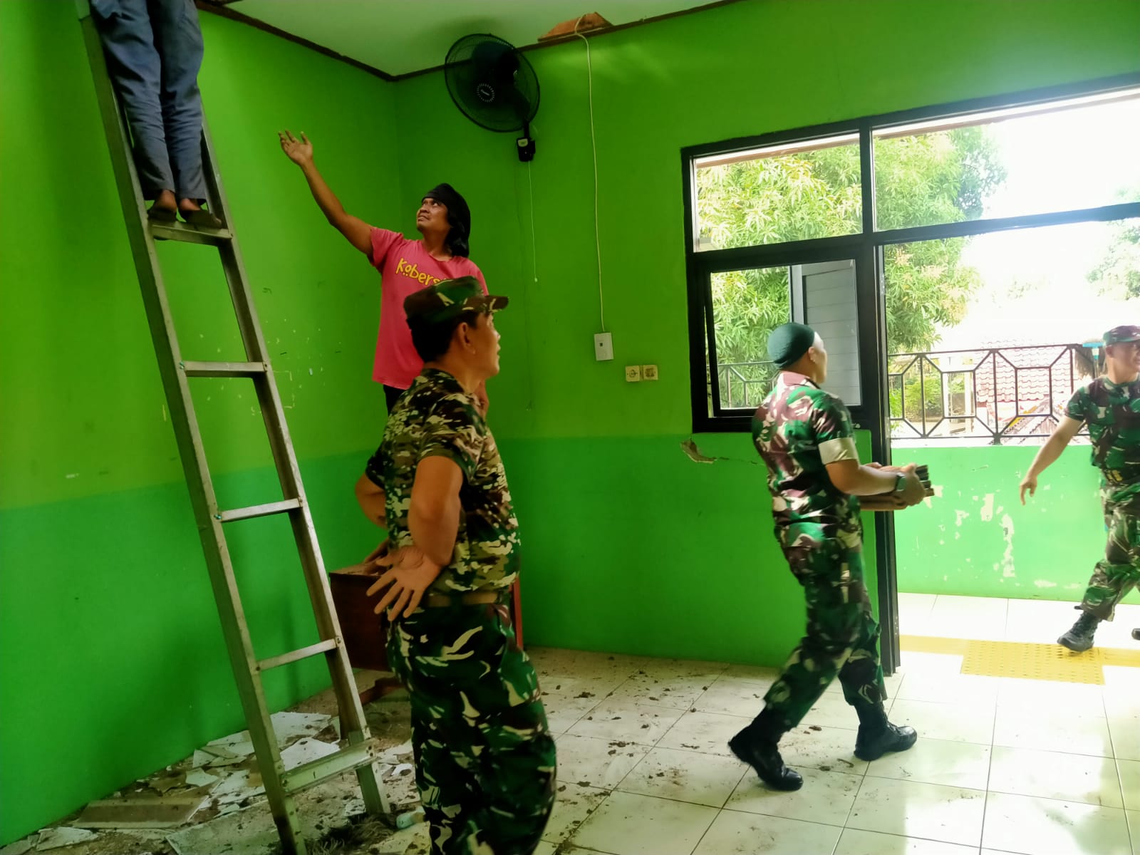 TNI peduli Pendidikan melalui Koramil 10/Lemahabang Bantu Bongkar Atap Ruang Kelas SLBN Kabupaten Cirebon yang Direhab